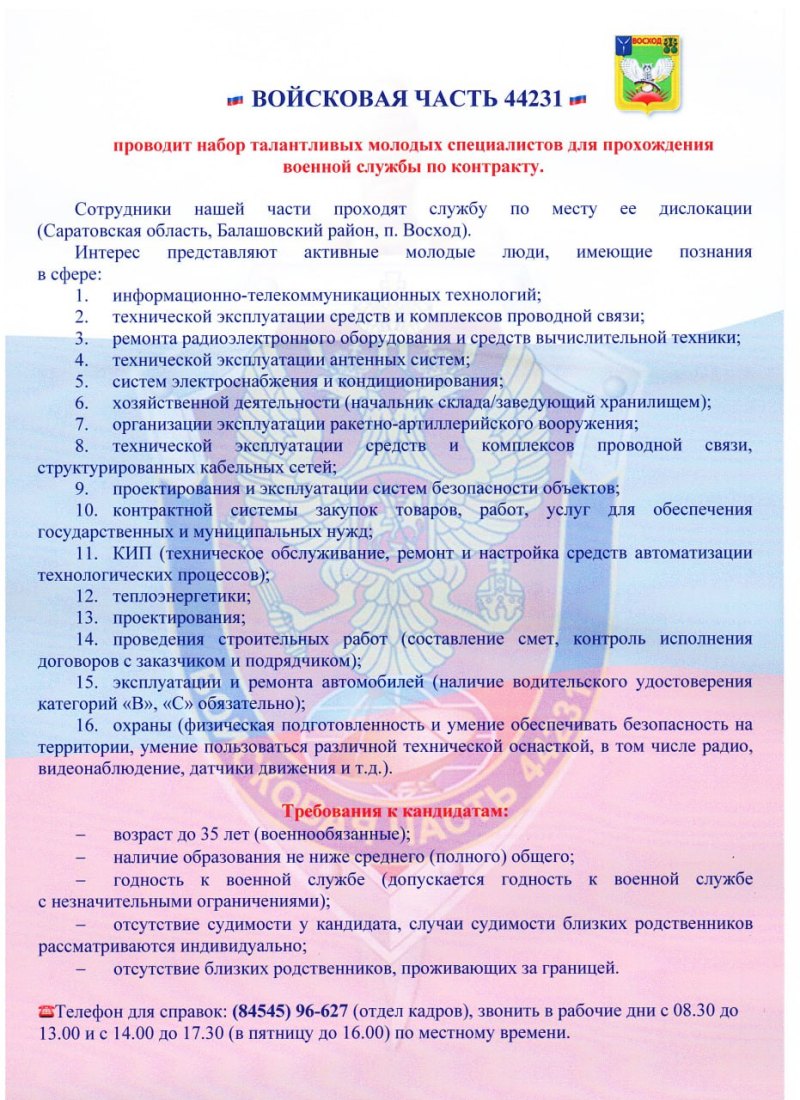 Для получения дополнительной информации можно обратиться в отдел кадров части по телефону (84545) 96-627.