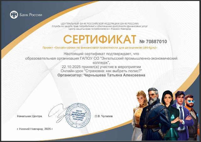 22 октября 2025 года студенты 4 курса группы 4ЭП122п специальности 11.02.16 Монтаж, техническое обслуживание и ремонт электронных приборов и устройств под руководством Чернышевой Татьяны Алексеевны, методиста, преподавателя колледжа, приняли участие в онлайн-уроке от Банка России на тему: «Страховка: как выбрать полис?».