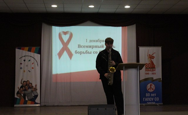 В рамках мероприятия был организован просмотр презентации «ВИЧ — инфекция» и в заключении выступил студент 1 курса Евстифеев Владислав с блюзовой композицией для саксофона.