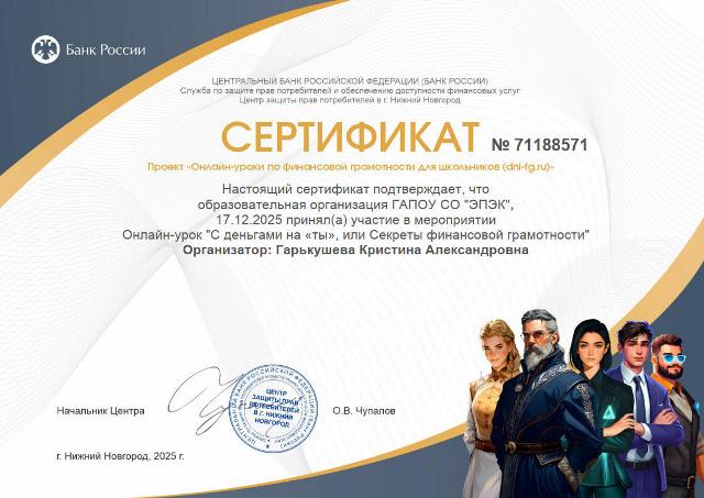 17 декабря 2025 года студенты первого курса группы 1ТД225 специальности «Торговое дело» активно участвовали во Всероссийском онлайн-уроке финансовой грамотности, организованным преподавателем специальных дисциплин экономического отделения ГАПОУ СО «ЭПЭК» К.А. Гарькушевой.