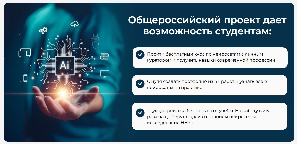 Изучение всех возможностей искусственного интеллекта позволяет студентам идти в ногу со временем и получить навыки работы, которые уже сейчас требуют работодатели. Освоив новые технологии, студенты могут нарабатывать стаж без отрыва от учебы.