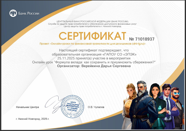 25 ноября 2025года, в рамках декады специальности, студенты 4 курса группы 4С122 специальности 08.02.01 Строительство и эксплуатация зданий и сооружений, под руководством Верейкиной Дарьи Сергеевны, преподавателя, приняли участие в онлайн-уроке «Формула вклада: как сохранить и приумножить сбережения?».