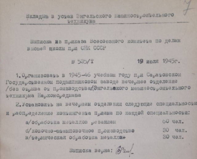 19 июля 1945 год – при Саратовском подшипниковым заводе открыто вечернее отделение (без отрыва от производства) (Приказ №595/Т Всесоюзного комитета по делам высшей школы при СНК СССР):